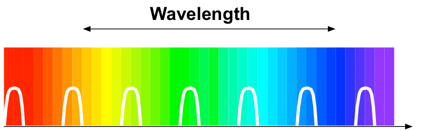 Today, this digital optical link uses intensity modulated direct detection systems such as the ones found in 10 Gigabit Ethernet links and in passive optical networks (PON). In these non-coherent systems, the signal modulation used is On-Off Keying (OOK). OOK is achieved by simply switching the laser source off and on. Non-coherent systems operate at lower power than analog optics and can therefore make better use of the wavelength spectrum in fiber. Figure 2 depicts the wavelength spectrum of fiber with several non-coherent OOK optical carriers.
