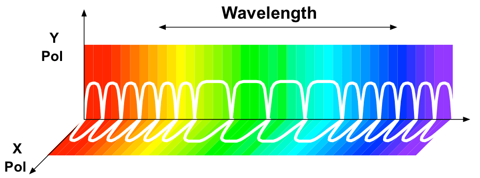 Coherent technology has been used to achieve higher speeds than any other optical technology. In coherent optics, both amplitude and phase modulation are used to put information onto an optical carrier. This enables the generation of Quadrature Phase Shift Keying (QPSK) and Quadrature Amplitude Modulation (QAM) constellations carrying information. The nature of the coherent signal also allows the separation of the optical signal in two orthogonal polarizations. Each polarization can independently carry the two-dimensional constellations mentioned above. The signal processing used in coherent systems facilitates shaping of the spectrum of the signal to avoid interference with adjacent optical carriers. Along with the much lower power requirements, coherent technology allows for efficient multiplexing of the optical carriers within the wavelength spectrum of fiber. Figure 3 shows the wavelength spectrum of fiber with coherent optical carriers over 2 polarizations.