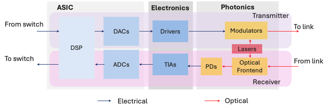 Modern coherent optical transceivers achieve unprecedented performance and efficiency through deep integration of electronics and photonics. The key building blocks are included in the diagram below.