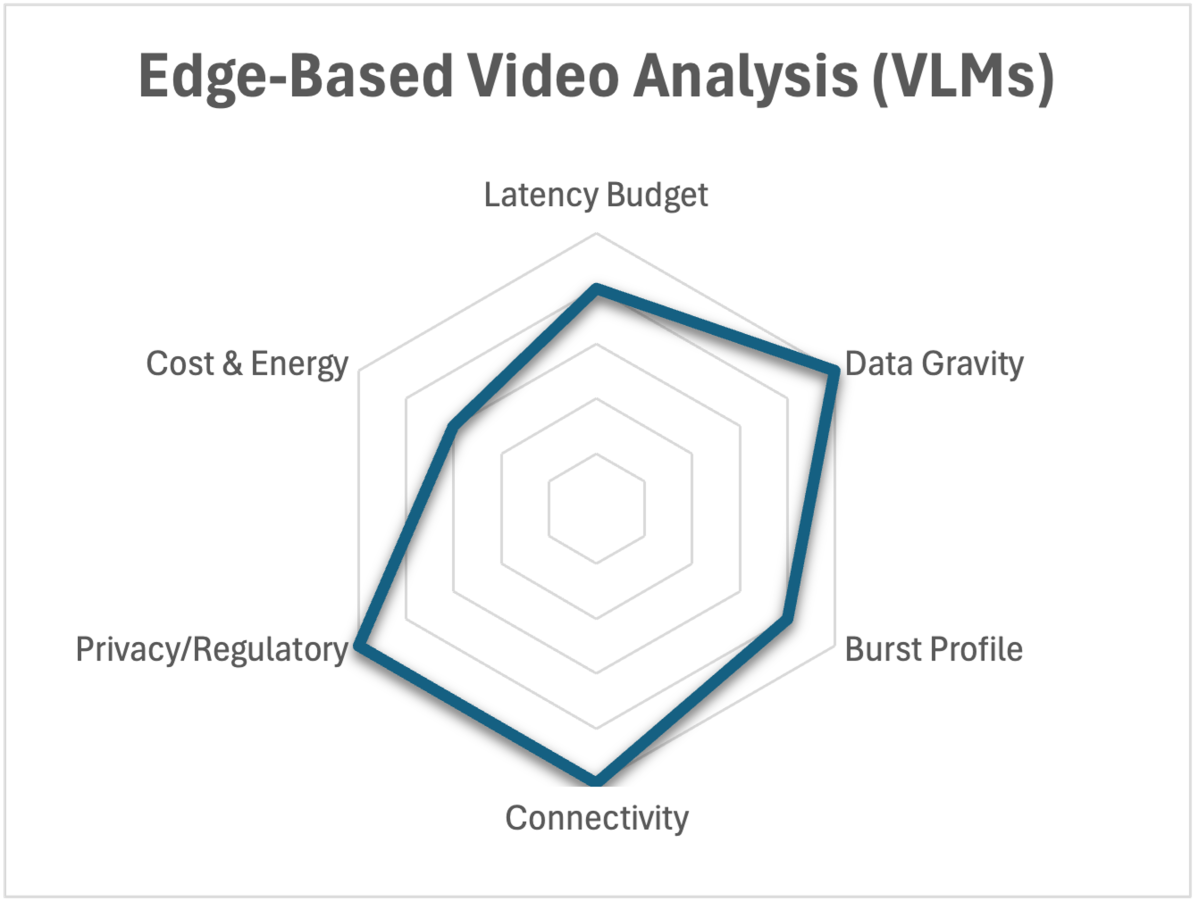 Not every AI workload belongs at the edge. We’re developing selection criteria to help operators evaluate where to place different workloads. The radar chart below shows how edge-based video analysis scores across these dimensions.